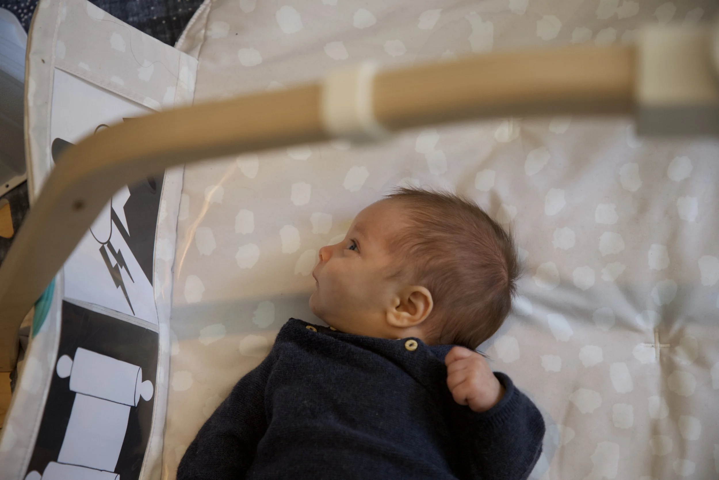 We also loved our Lovevery mobile which is a different take on the Munari mobile. Honestly, Yitzchak loved it a lot more than the classic Montessori mobile. It flips for when the baby is older to a pretty colored side. We used it over our changing table and it made diaper changes so much better. We brought it across the country on our road trip and Yitzchak was always thrilled to see it come out.